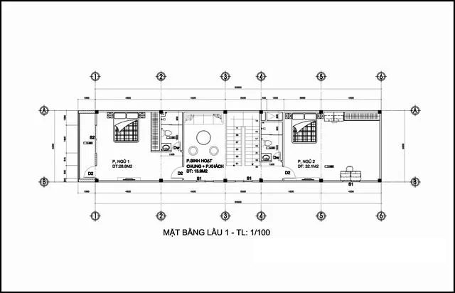 Bản vẽ thiết kế công năng mẫu thiết kế nhà phố 2 tầng 1 tum 5x20m kinh doanh  Mẫu thiết kế nhà phố 2 tầng nằm trong khu đất liền kề đang cần giải tỏa để làm đường lớn; Nên giải pháp xây nhà là móng cao 75cm đến 1m; Lỡ sau này có làm đường mới dù nâng lên thì vẫn cao ráo thông thoáng.  Bản vẽ mẫu nhà này phía sau còn khoảng đất trống hơn 1m giáp với dãy nhà trọ cấp 4; Và có lối vào ở cửa sau. Nên không gian thiết kế chia thành 2 không gian chính. Phía sau thiết kế 1 bếp và khách cho chủ nhà sinh hoạt riêng có cửa khóa trái. Phía sau không liên quan đến phần cho thuê mặt bằng phía ngoài. Tương lai gần vài năm sau khi không cho thuê có thể cải tạo thành 1 phòng ngủ trệt được. Tiện lợi là không phải đập bỏ hay phá vỡ kết cấu.  Mẫu thiết kế nhà phố  Diện tích tầng trệt có phòng kinh doanh thiết kế rộng 42 m2. Phòng khách phía sau cầu thang đi vào rộng hơn 20 m2 và bếp ăn rộng 19,6m2 có chỗ để xe máy. Còn lại cầu thang thiết kế rộng 2.2m chân cầu thang có vệ sinh và bồn rửa. Khác biệt nữa chính là không gian kinh doanh cạnh cầu thang trước mắt. Vách ngăn nhôm kính ngay phía ngoài đi vào để che cầu thang; Nhưng khi khách thuê có thể ra sau vệ sinh được. Bản vẽ không gian tầng lầu 1 nhà ống 2 tầng 1 tum 5x20m  Không gian mẫu thiết kế nhà phố hiện đại 2 tầng 1 tum có diện tích sàn xây dựng hơn 110m2. Phía ngoài có thêm ban công lan can kính cường lực 10 ly khung thép. Tiện ích bên trong thiết kế có 1 phòng ngủ master phía sau rộng hơn 32 m2; Có phòng tập Gym và bàn làm việc, phòng thay đồ đầy đủ. Phòng sinh hoạt chung bố trí thiết kế cạnh cầu thang lối lên từ tầng trệt diện tích rộng gần 14m2. Có thể tiếp khách riêng tại đây hay thư giãn chuyện trò.