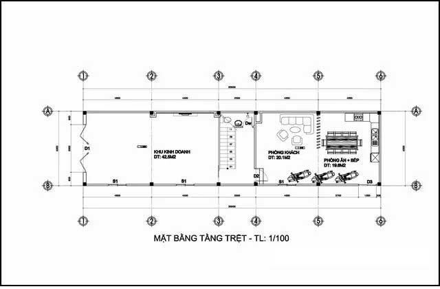 Bản vẽ thiết kế công năng mẫu thiết kế nhà phố 2 tầng 1 tum 5x20m kinh doanh  Mẫu thiết kế nhà phố 2 tầng nằm trong khu đất liền kề đang cần giải tỏa để làm đường lớn; Nên giải pháp xây nhà là móng cao 75cm đến 1m; Lỡ sau này có làm đường mới dù nâng lên thì vẫn cao ráo thông thoáng.  Bản vẽ mẫu nhà này phía sau còn khoảng đất trống hơn 1m giáp với dãy nhà trọ cấp 4; Và có lối vào ở cửa sau. Nên không gian thiết kế chia thành 2 không gian chính. Phía sau thiết kế 1 bếp và khách cho chủ nhà sinh hoạt riêng có cửa khóa trái. Phía sau không liên quan đến phần cho thuê mặt bằng phía ngoài. Tương lai gần vài năm sau khi không cho thuê có thể cải tạo thành 1 phòng ngủ trệt được. Tiện lợi là không phải đập bỏ hay phá vỡ kết cấu.  Mẫu thiết kế nhà phố  Diện tích tầng trệt có phòng kinh doanh thiết kế rộng 42 m2. Phòng khách phía sau cầu thang đi vào rộng hơn 20 m2 và bếp ăn rộng 19,6m2 có chỗ để xe máy. Còn lại cầu thang thiết kế rộng 2.2m chân cầu thang có vệ sinh và bồn rửa. Khác biệt nữa chính là không gian kinh doanh cạnh cầu thang trước mắt. Vách ngăn nhôm kính ngay phía ngoài đi vào để che cầu thang; Nhưng khi khách thuê có thể ra sau vệ sinh được. Bản vẽ không gian tầng lầu 1 nhà ống 2 tầng 1 tum 5x20m  Không gian mẫu thiết kế nhà phố hiện đại 2 tầng 1 tum có diện tích sàn xây dựng hơn 110m2. Phía ngoài có thêm ban công lan can kính cường lực 10 ly khung thép. Tiện ích bên trong thiết kế có 1 phòng ngủ master phía sau rộng hơn 32 m2; Có phòng tập Gym và bàn làm việc, phòng thay đồ đầy đủ. Phòng sinh hoạt chung bố trí thiết kế cạnh cầu thang lối lên từ tầng trệt diện tích rộng gần 14m2. Có thể tiếp khách riêng tại đây hay thư giãn chuyện trò.